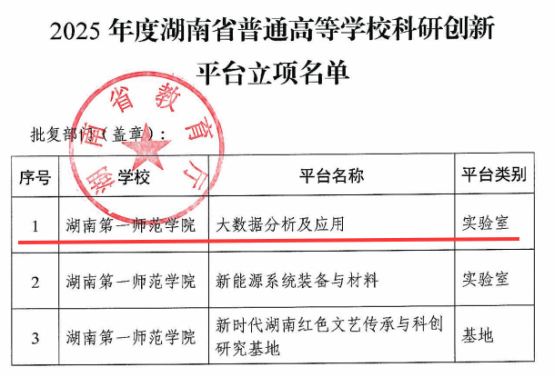 近日,湖南省教育厅印发《湖南省教育厅关于公布2025年度湖南省普通高等学校科研创新平台立项名单的通知》(湘教通[2025]233号),我院申报的“大数据分析及应用”实验室成功获批湖南省普通高等学校重点实验室。该实验室是学院近年来在“大数据与智能算法”领域开展有组织科研所取得的一项重要成果,实现了学院在省级科研创新平台方面取得的又一重大成果,标志着学院在学科建设上迈上了新的台阶。