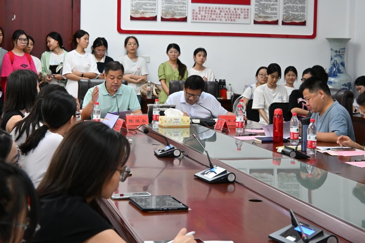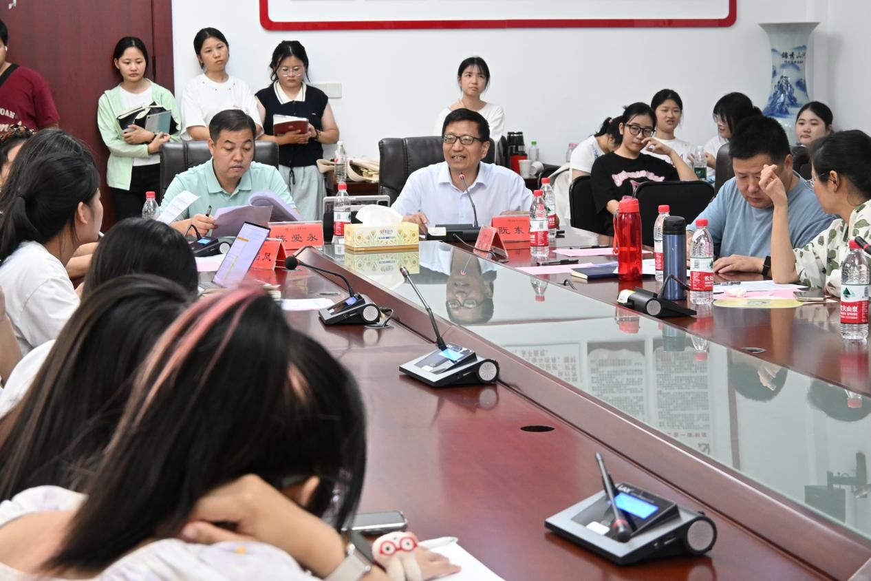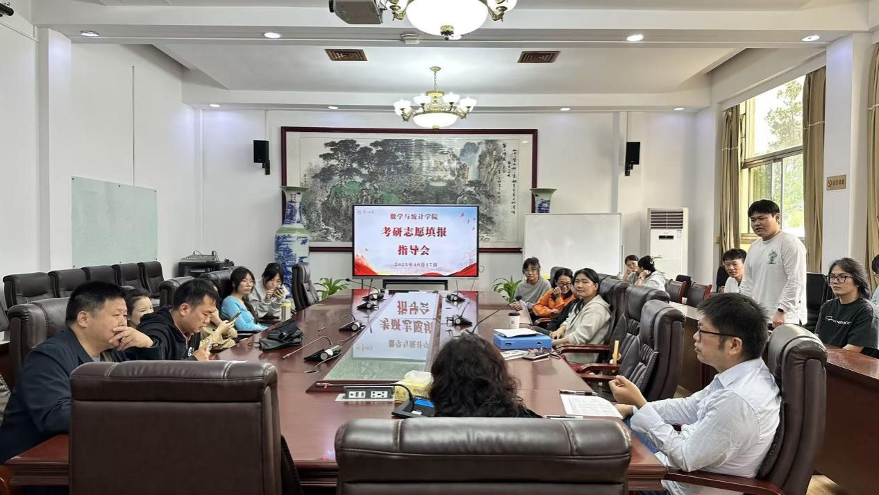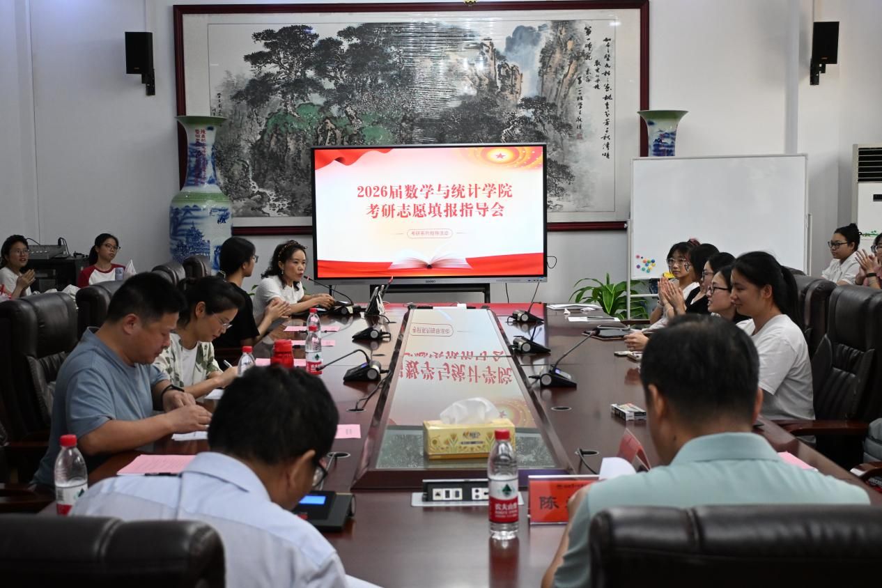 为帮助2026届毕业生全面把握考研形势,科学规划报考目标,提升志愿填报的精准度与成功率,数学与统计学院于10月9日与10月17日下午,在学院会议室分两轮组织召开了考研志愿填报指导交流会,会议采用线上线下相结合的方式。会议由学院党委副书记申鸣凤主持。学院党委书记阮东彪、院长陈爱永、副院长王增赟以及考研指导教师张更容、邓海英、潘超红、颜斌受邀出席,考研专干彭晨嘉及全体考研学生共同参与。