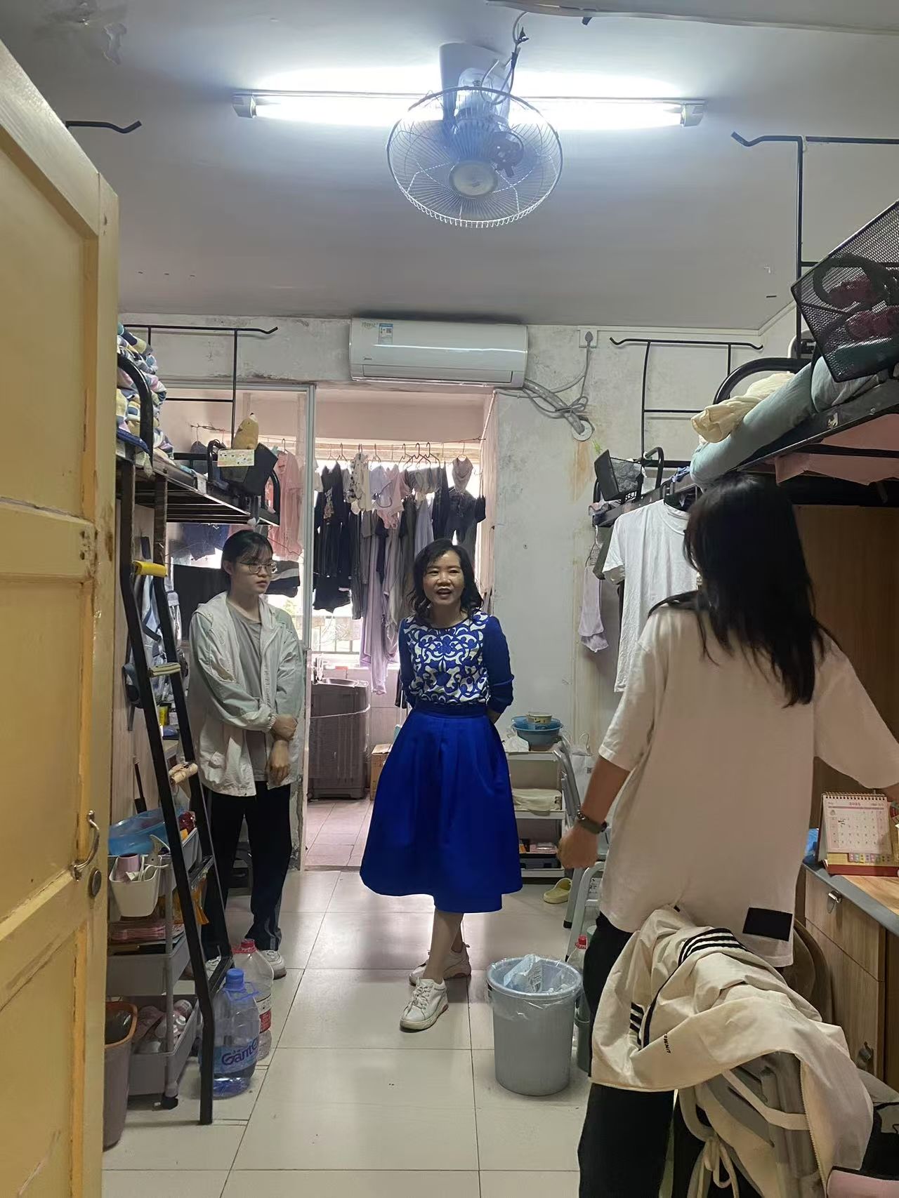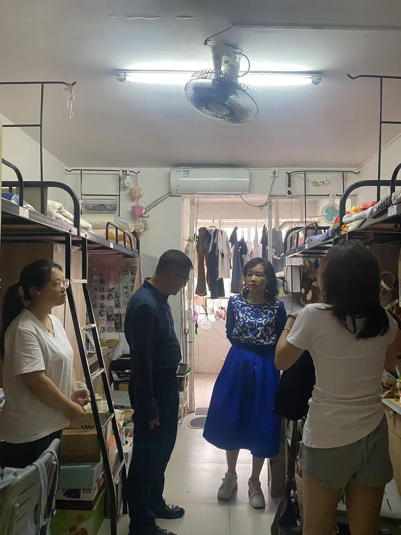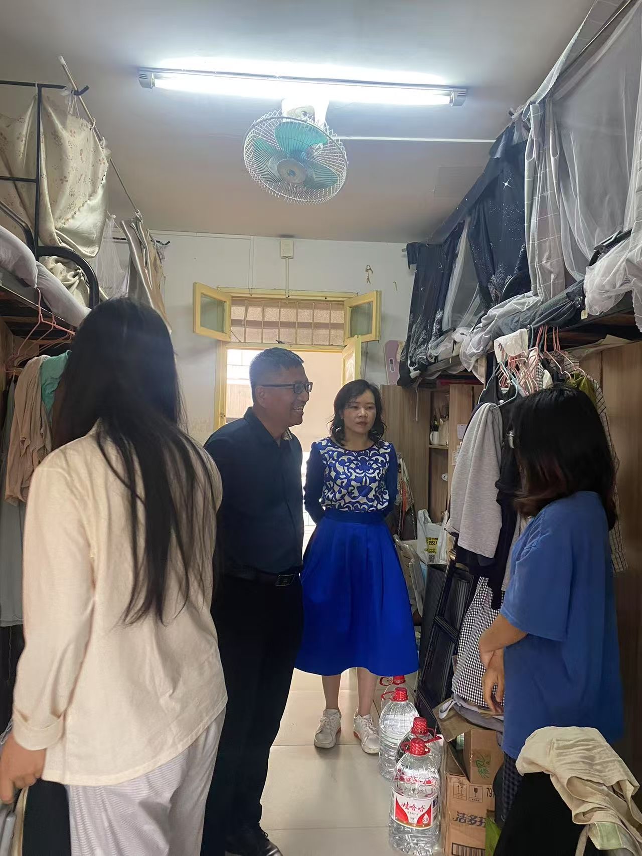 书记下寝 | 数统学院开展五一节前宿舍安全大检查 发布时间:2025-04-30 作者: 浏览次数:次 4月30日下午,数学与统计学院党委书记阮东彪、副书记申鸣凤带领辅导员走访3栋学生宿舍,临近五一假期,老师们对宿舍安全问题进行了重点排查。在用电安全方面,仔细检查是否存在违规使用大功率电器的情况,同时重点查看插座线路是否人走电断、有无私拉乱接现象,向学生强调违规用电的危害,要求严格遵守宿舍管理规定,确保无安全隐患遗留。书记们也鼓励大家利用假期适当放松的同时,也不要忘记学习,为下一阶段的学习生活做好准备。