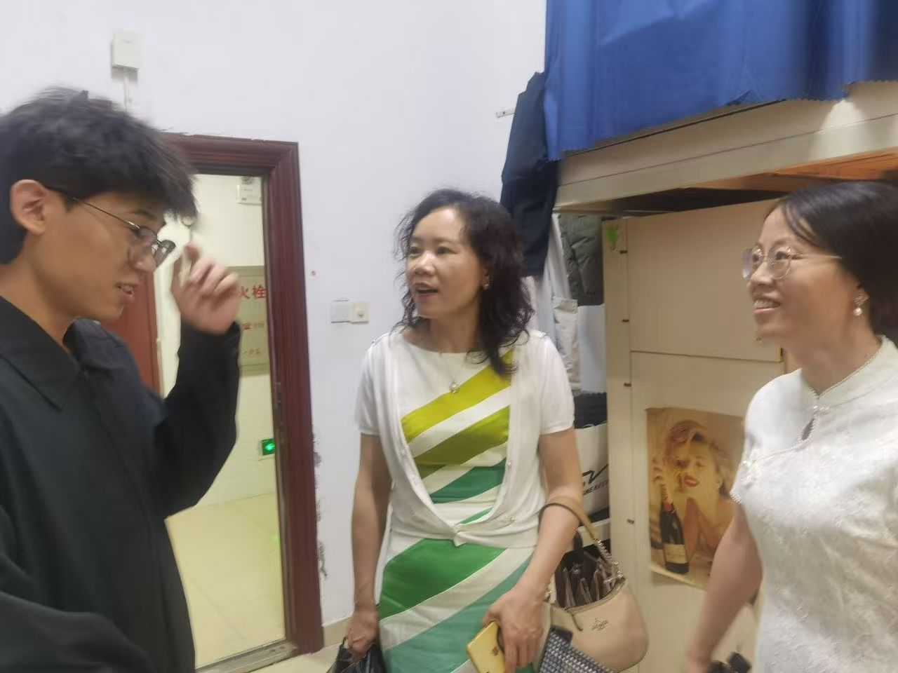书记下寝 | 学院领导老师深入走访学生宿舍 发布时间:2025-05-23 作者: 浏览次数:次 5月23日晚,数学与统计学院党委副书记申鸣凤携辅导员老师、班主任深入学生寝室,对多个寝室展开走访工作。在交流过程中,书记重点强调要维持整洁的居住环境,建议同学们通过合理收纳个人物品提升空间利用率,并重申安全用电准则,要求全员共同守护宿舍安全秩序。并对学业压力、作息规律等问题给予针对性指导,特别提醒同学们注意劳逸结合,提倡早睡早起的健康作息模式